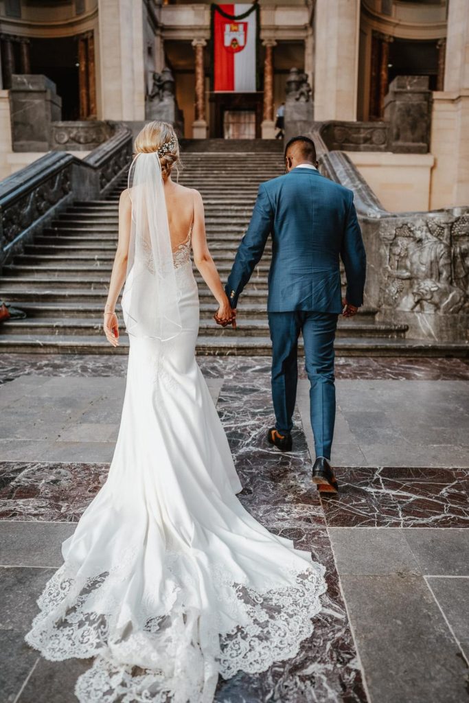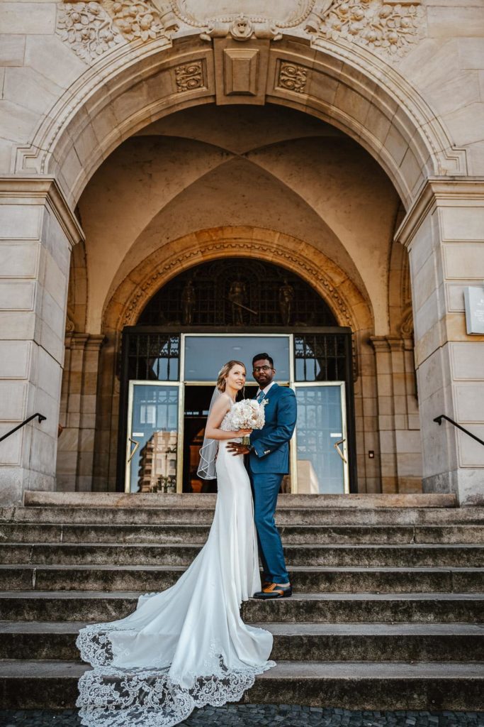 Nach der Trauung fuhren wir zum Brautpaarshooting zum Neuen Rathaus Hannover. Das elegante Brautkleid passte perfekt zu der wunderschönen Braut und schuf eine märchenhafte Atmosphäre. Das traumhafte Licht an diesem sonnigen Tag ermöglichte es uns, atemberaubende Fotos zu machen, die die Eleganz und Freude des Paares einfingen.