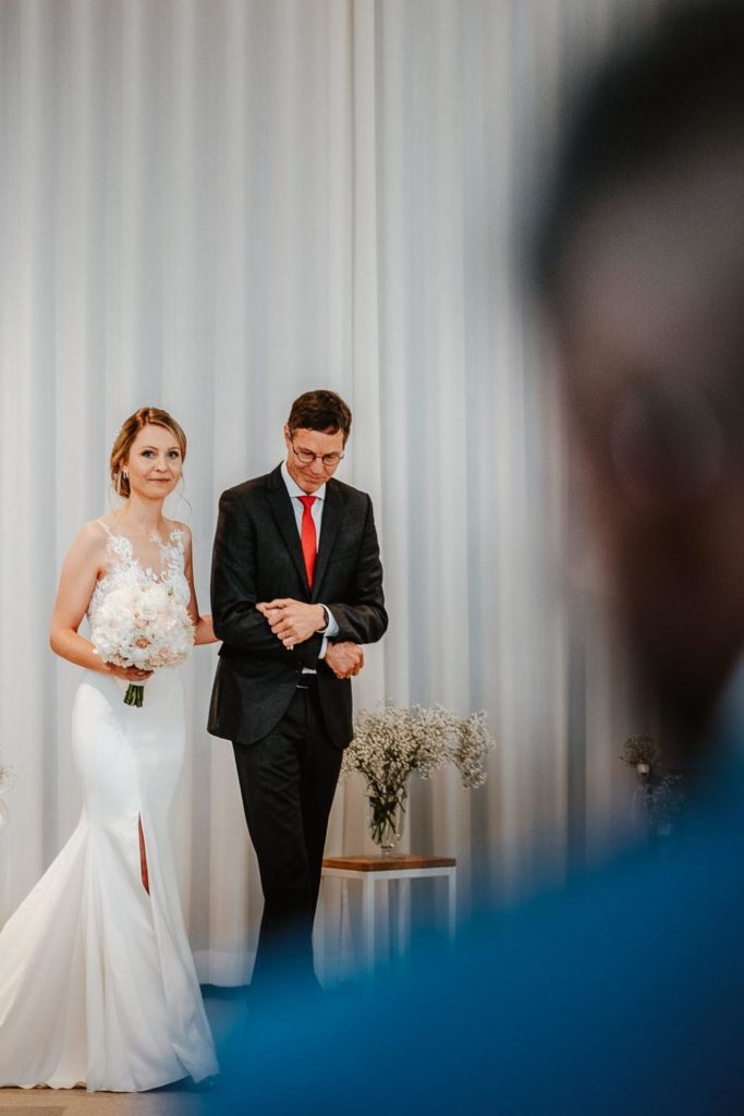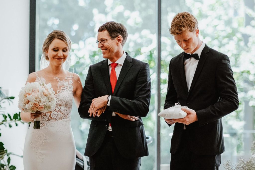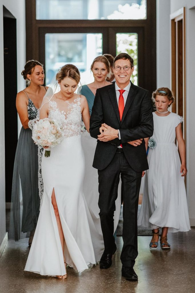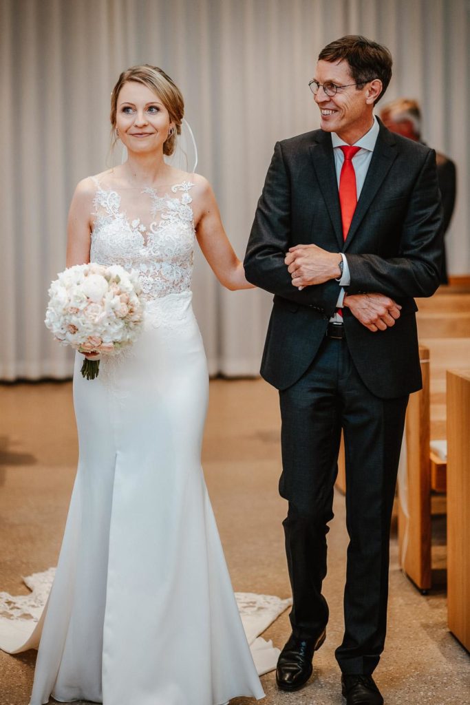 Der Hochzeitstag begann mit einer rührenden kirchlichen Trauung in der Neuapostolischen Kirche Hannover Süd. Viele Freunde und Familienangehörige waren anwesend, um diesen besonderen Moment zu teilen. Die Braut, begleitet von ihrem Vater, schritt den Gang entlang, während der Bräutigam voller Vorfreude vorne wartete. Die Zeremonie war erfüllt von Gesang und Gebeten, die die Liebe und den Glauben des Paares widerspiegelten. Nach der Trauung folgte eine herzliche Gratulation von Familie und Freunden, begleitet von einem feierlichen Anstoßen.