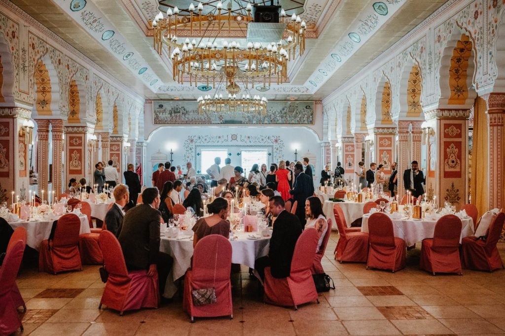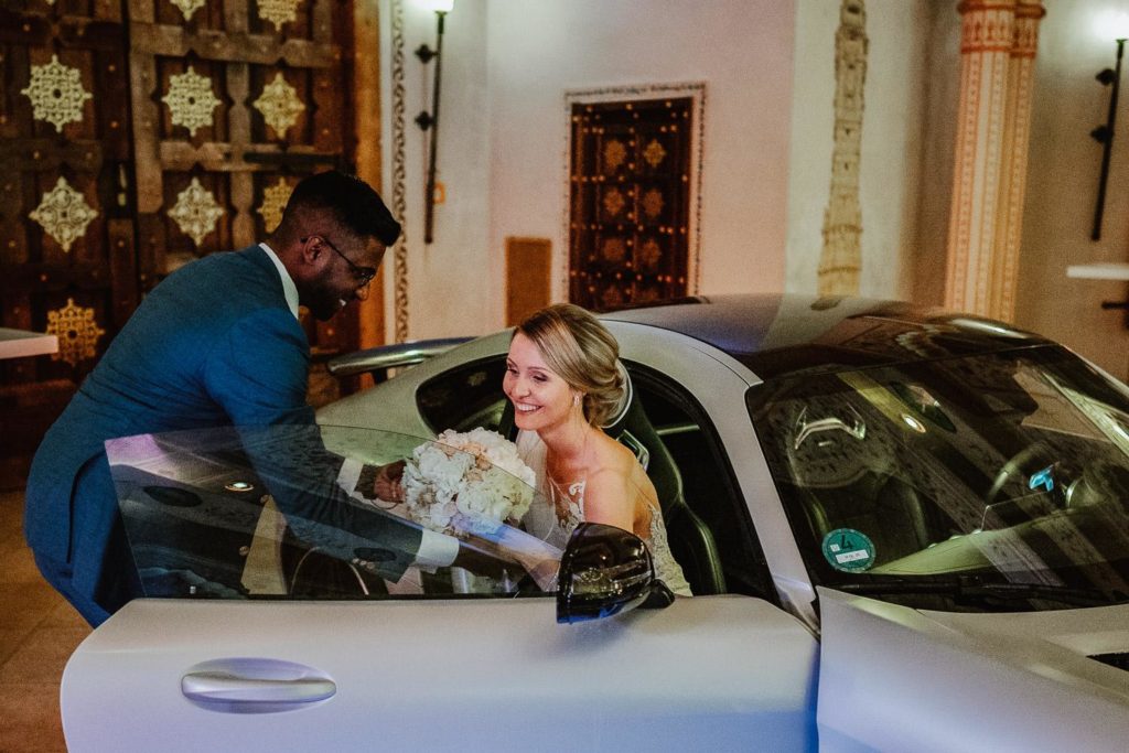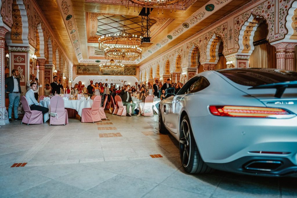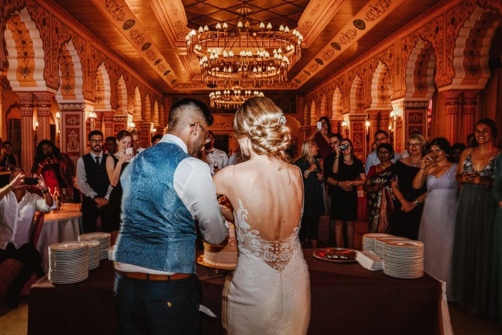 Die Hochzeitsfeier fand im beeindruckenden Maharadscha-Saal im Zoo Hannover statt. Der prunkvolle Empfang des Brautpaares war überraschend und stilvoll. Sie fuhren mit ihrem Hochzeitsauto durch das große Tor direkt in die Location hinein – ein wahrhaft königlicher Auftritt, der die Gäste staunen ließ.