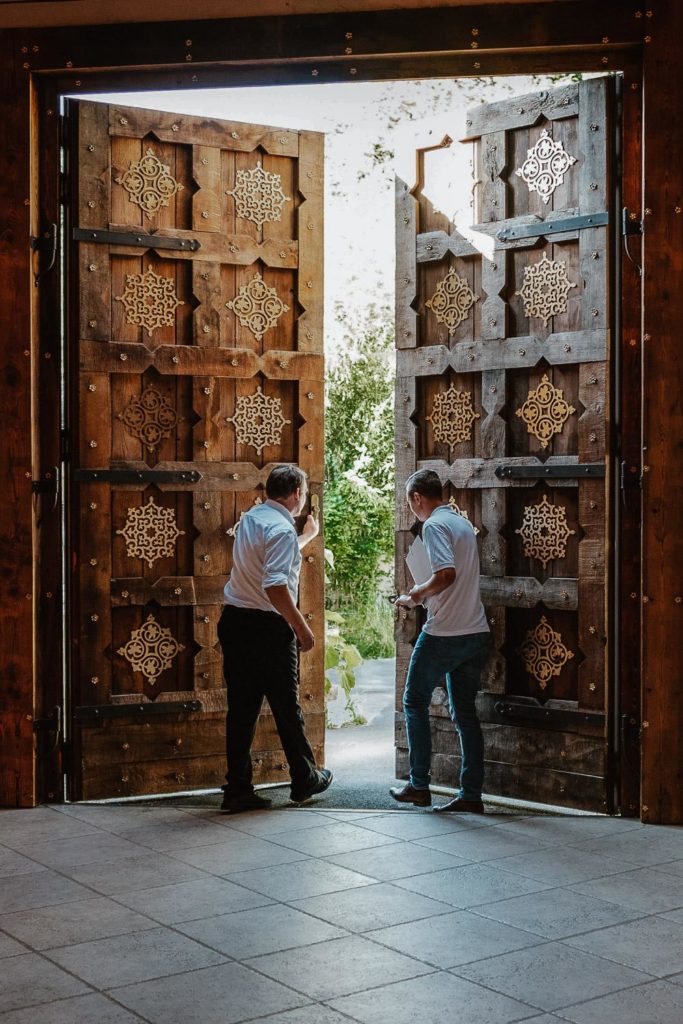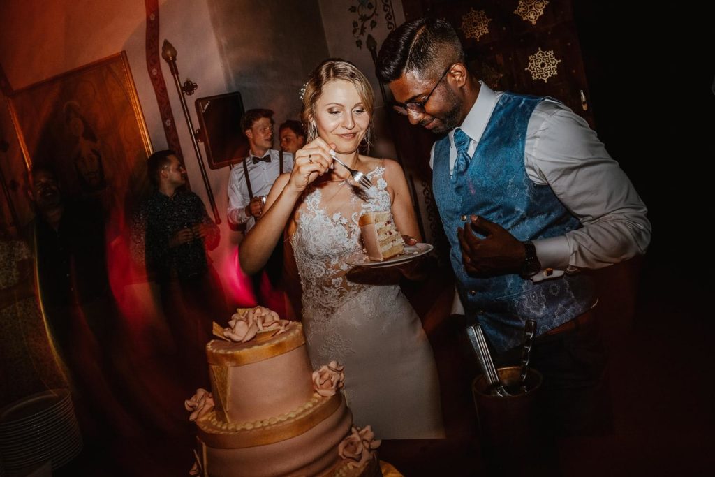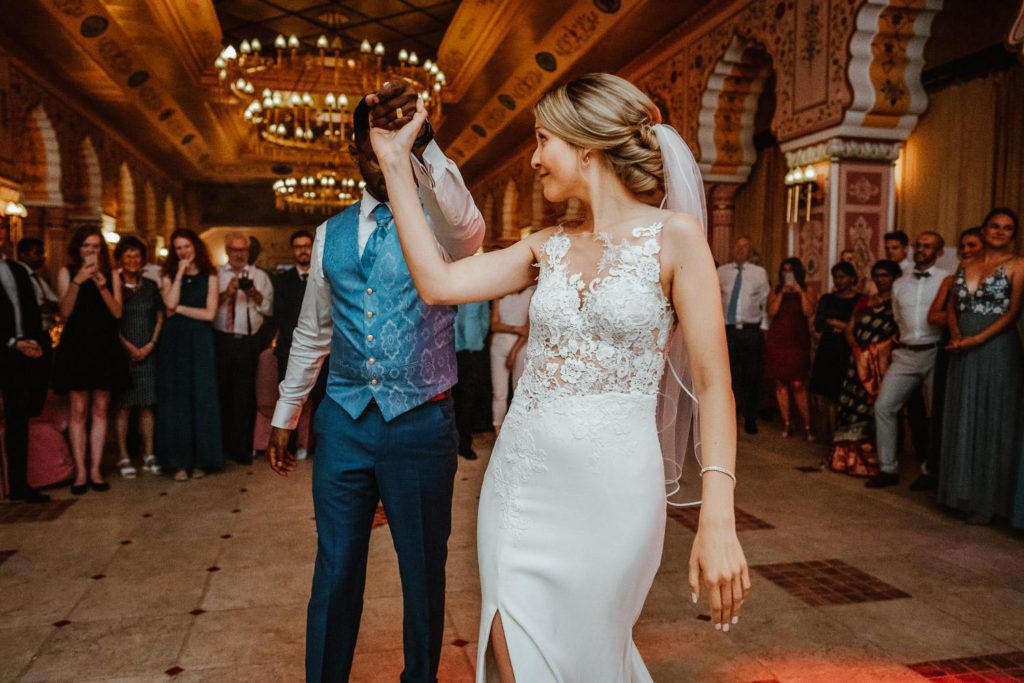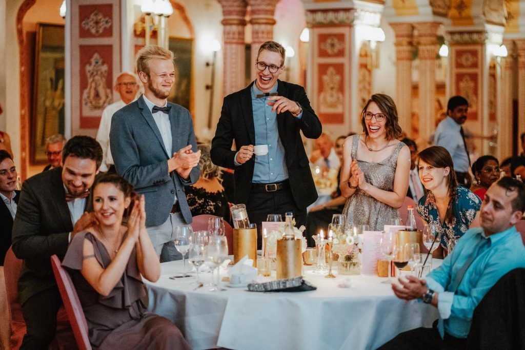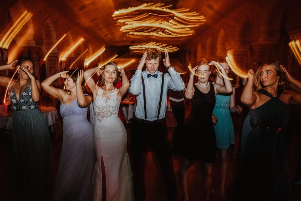 Die Hochzeitsfeier fand im beeindruckenden Maharadscha-Saal im Zoo Hannover statt. Der prunkvolle Empfang des Brautpaares war überraschend und stilvoll. Sie fuhren mit ihrem Hochzeitsauto durch das große Tor direkt in die Location hinein – ein wahrhaft königlicher Auftritt, der die Gäste staunen ließ.
