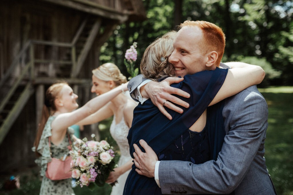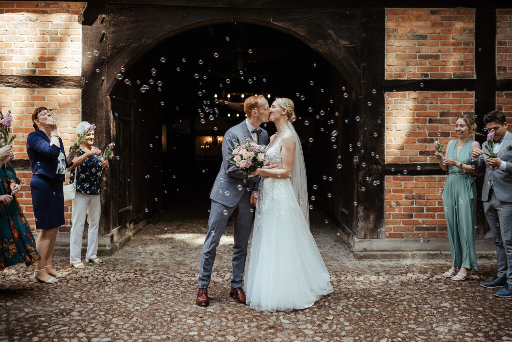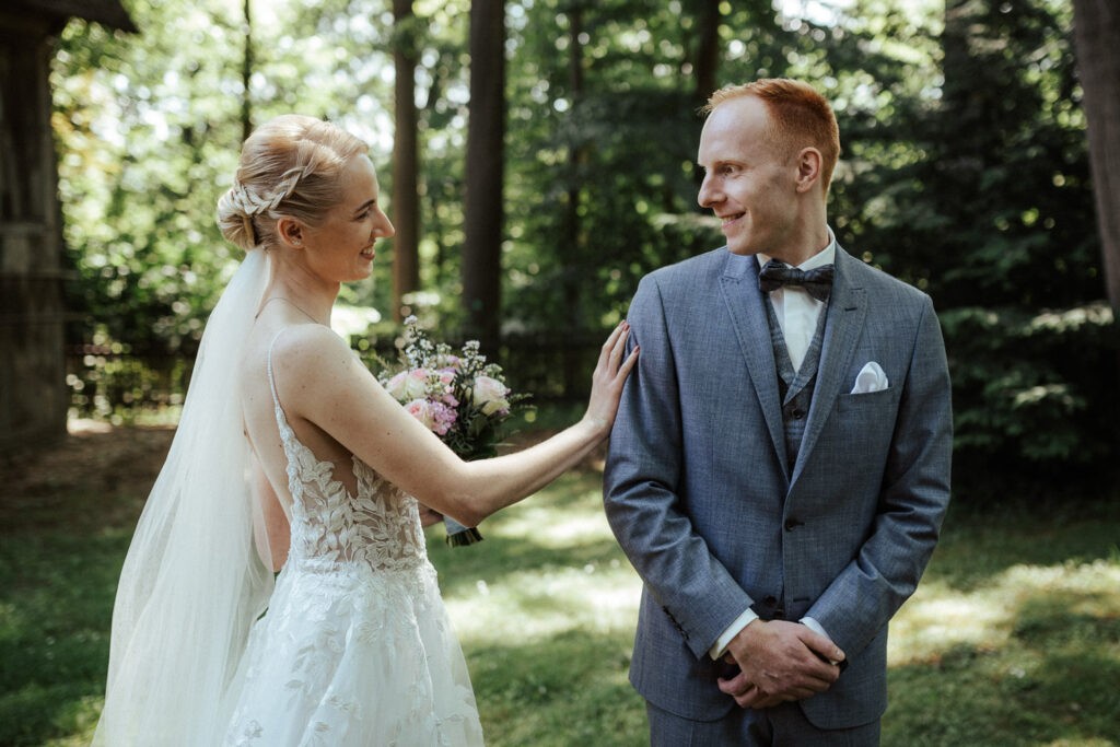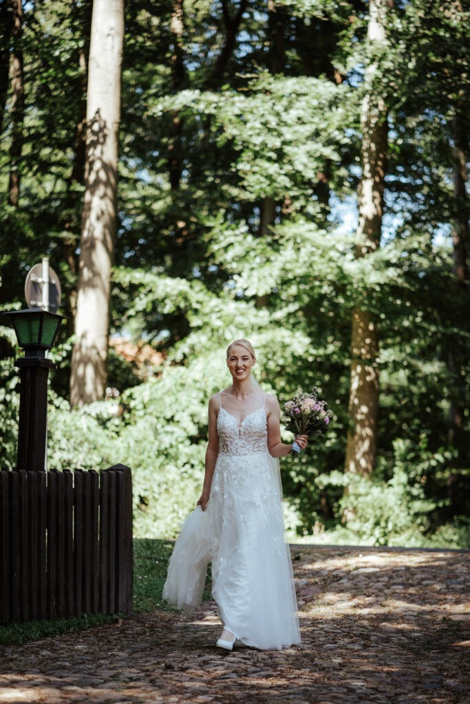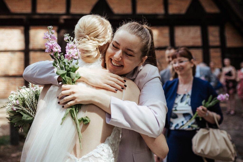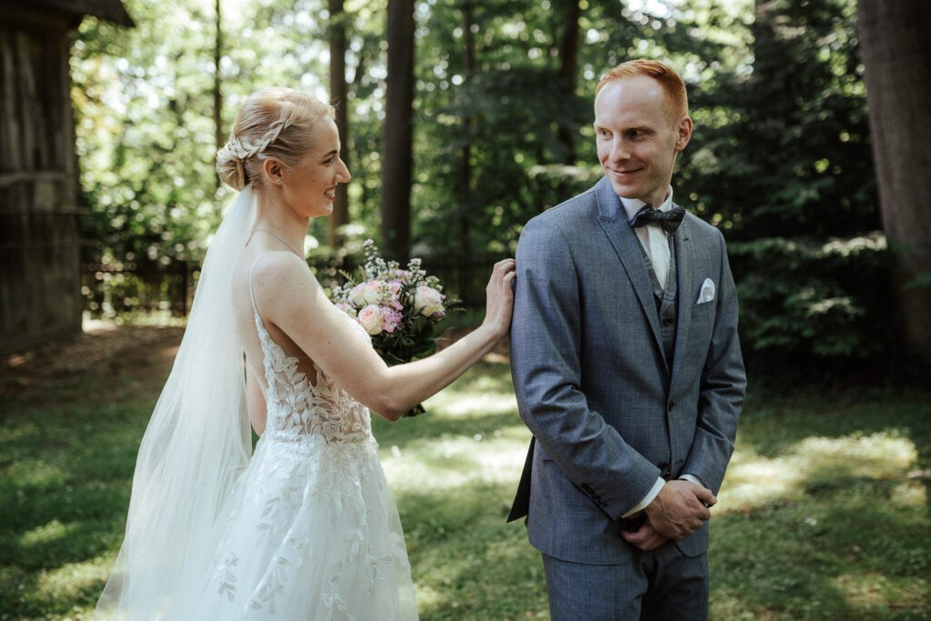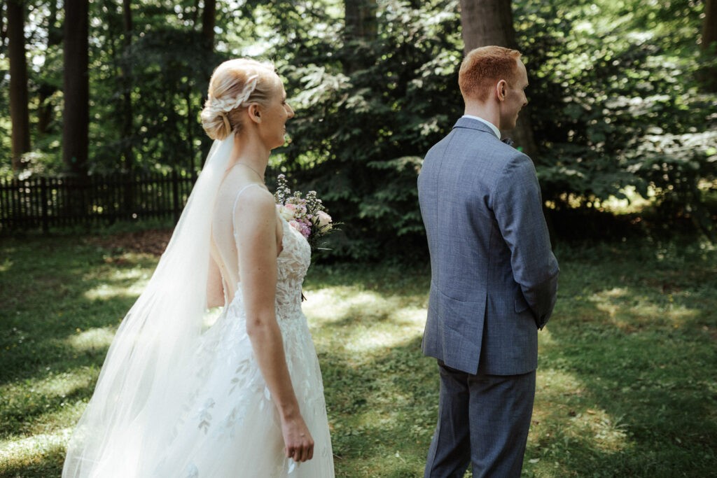 Der Tag begann mit einem unvergesslichen First Look des Brautpaares im Hof der Heidmark in Bad Fallingbostel. Die traumhafte Kulisse des historischen Hofes, umgeben von malerischer Natur, bot den perfekten Rahmen für diesen besonderen Moment. Die Emotionen waren greifbar, als das Brautpaar sich zum ersten Mal in voller Hochzeitsmontur sah – ein Augenblick voller Liebe und Vorfreude.