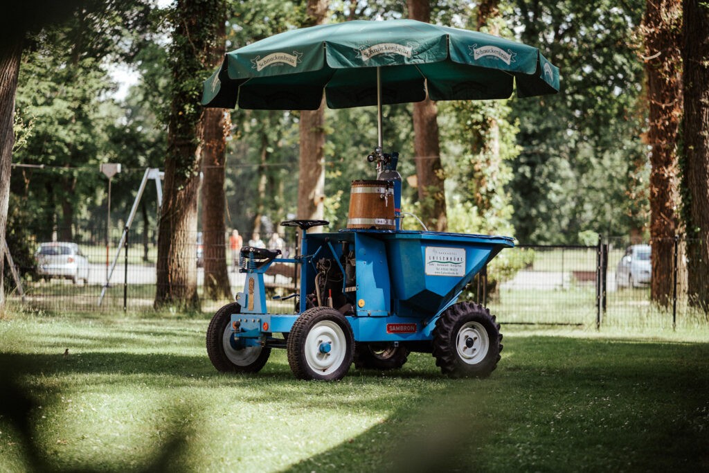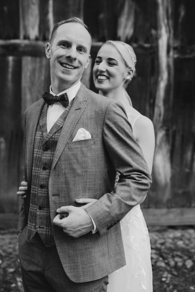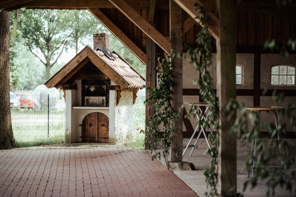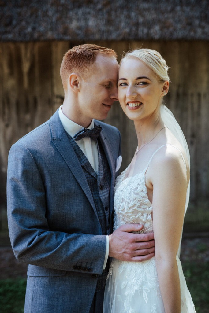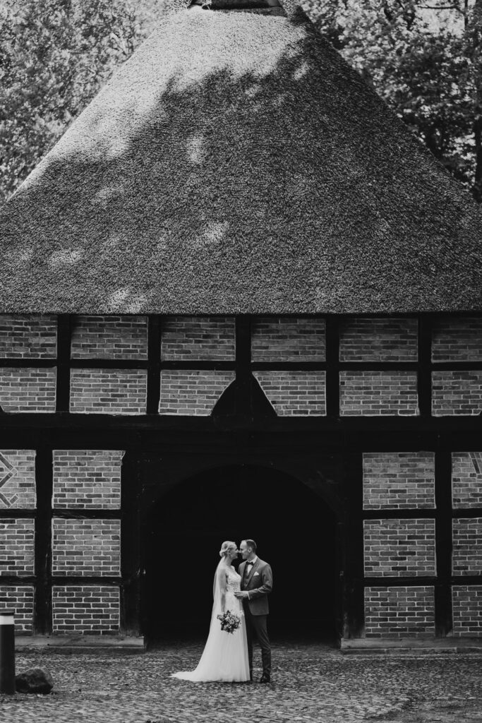 Nach der Trauung ging es stilecht mit einem Hochzeitsanhänger weiter zur nächsten Location. Der erste Teil des Brautpaarshootings fand noch im Hof der Heidmark statt, wo wir die wunderschöne Umgebung für romantische und authentische Aufnahmen nutzten.