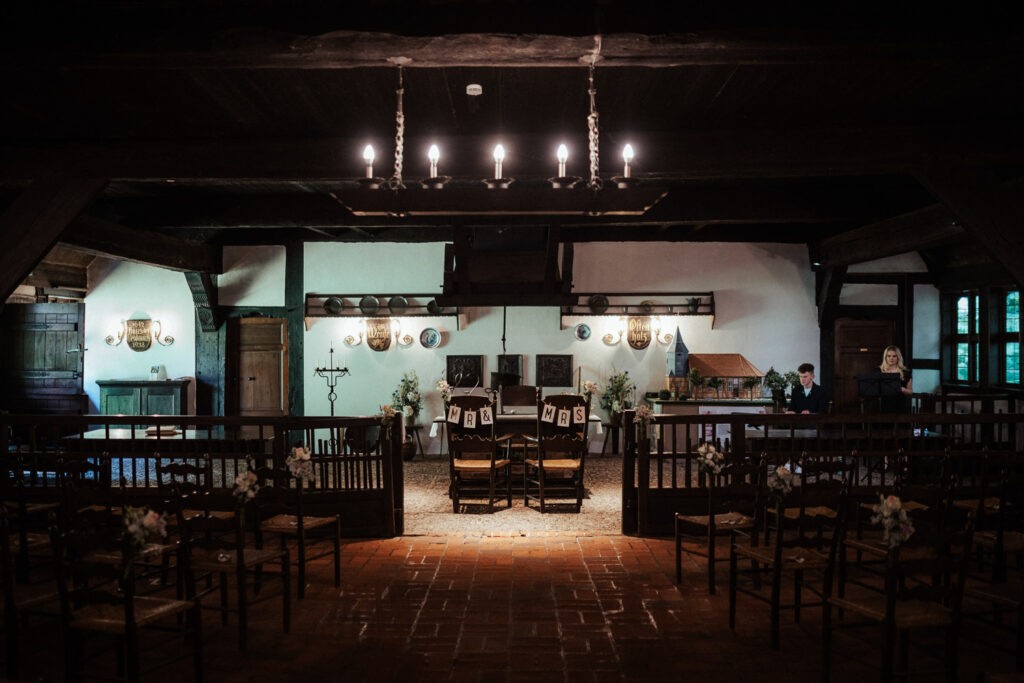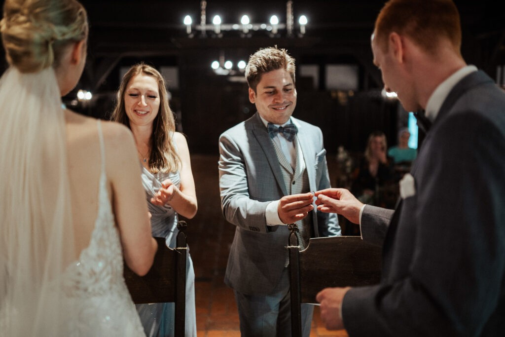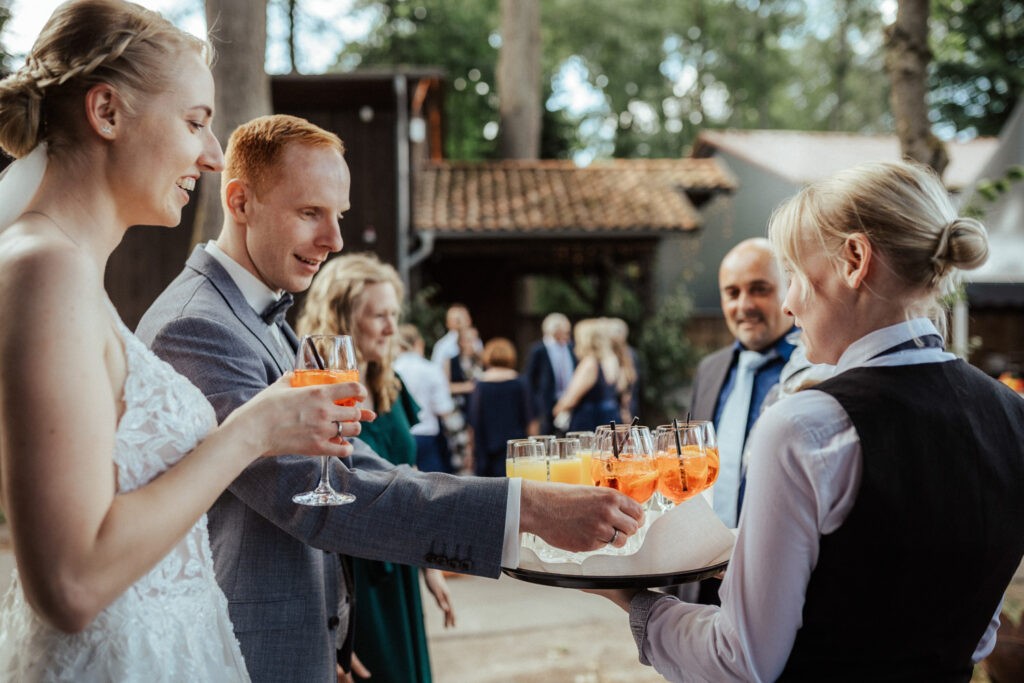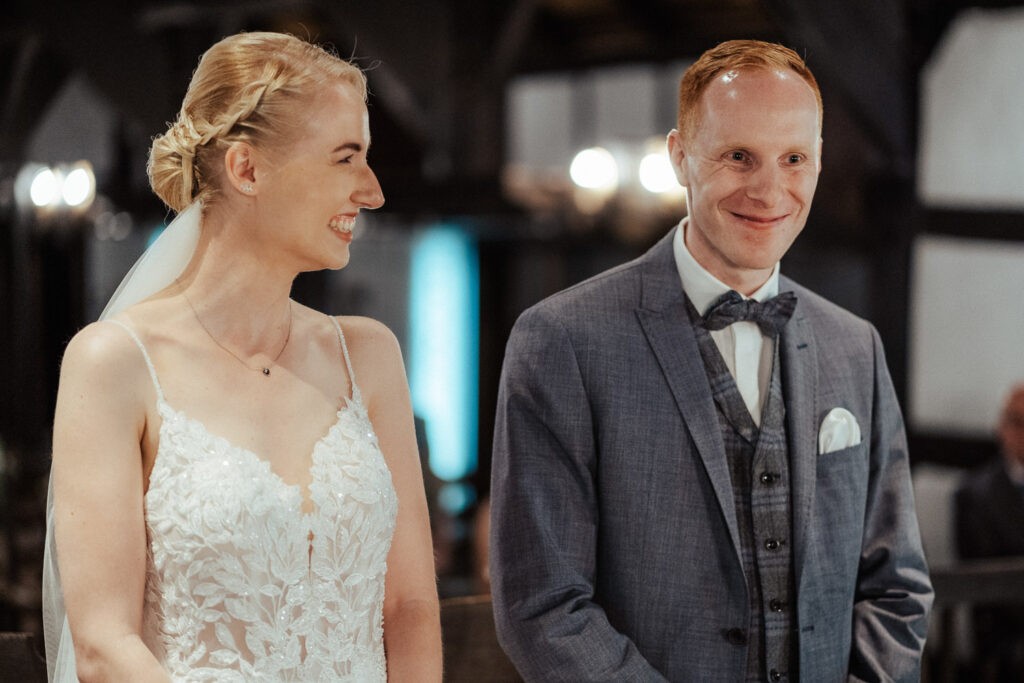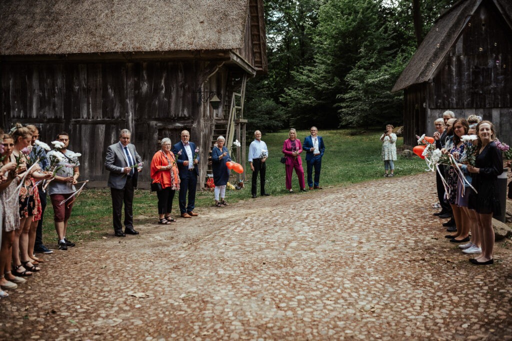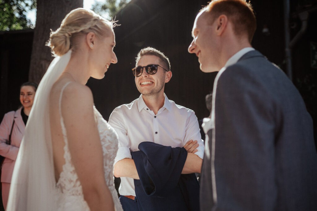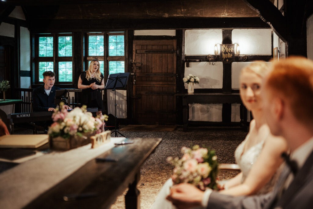 Die standesamtliche Trauung fand ebenfalls im Hof der Heidmark statt. Begleitet von Livegesang und Pianomusik, wurde die Zeremonie zu einem emotionalen Highlight. Die sanften Klänge untermalten die bewegenden Worte und verliehen der Trauung eine besondere, intime Atmosphäre.