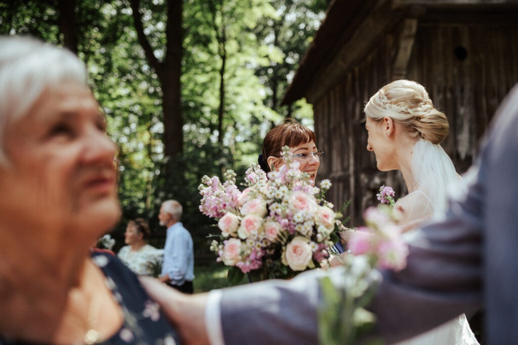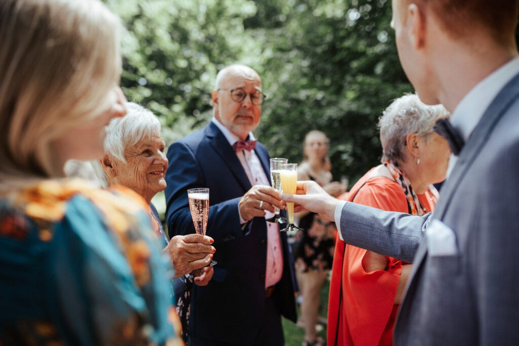 Anschließend gab es eine herzliche Gratulation mit einem Sektempfang, bei dem Brezeln und Kuchen als kleiner Vorgeschmack auf die kommenden Feierlichkeiten serviert wurden. Die Gäste genossen die entspannte Atmosphäre und freuten sich mit dem Brautpaar über den gelungenen Start in den gemeinsamen Lebensweg.