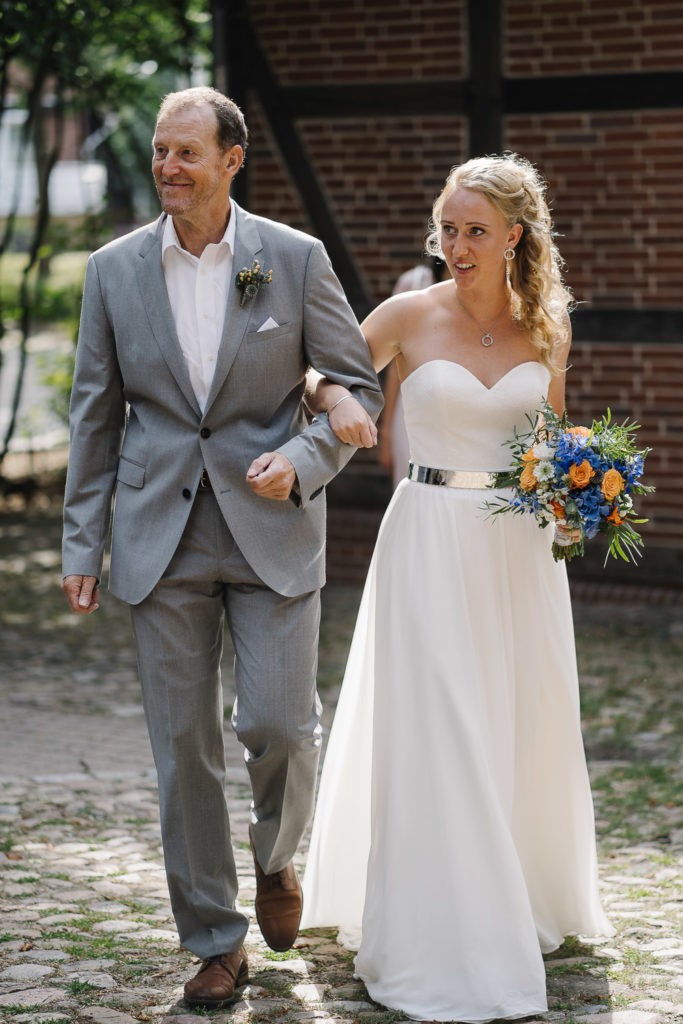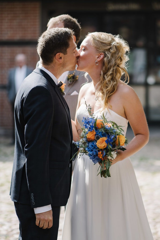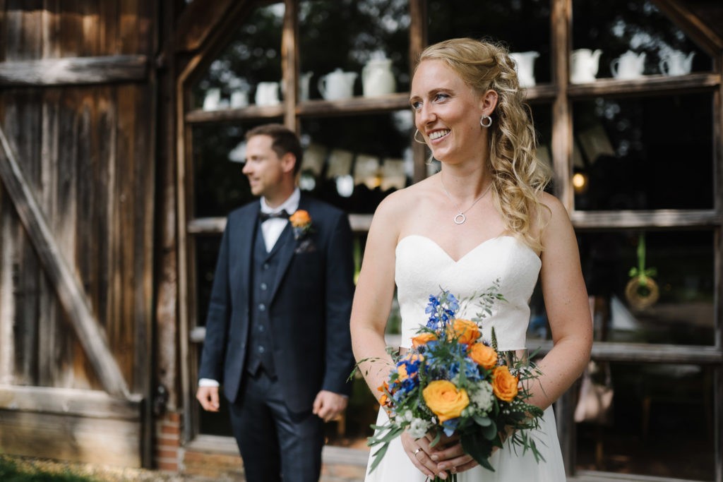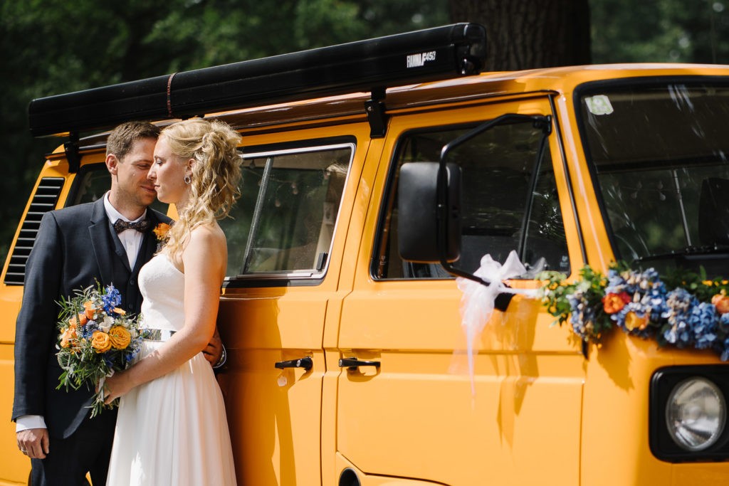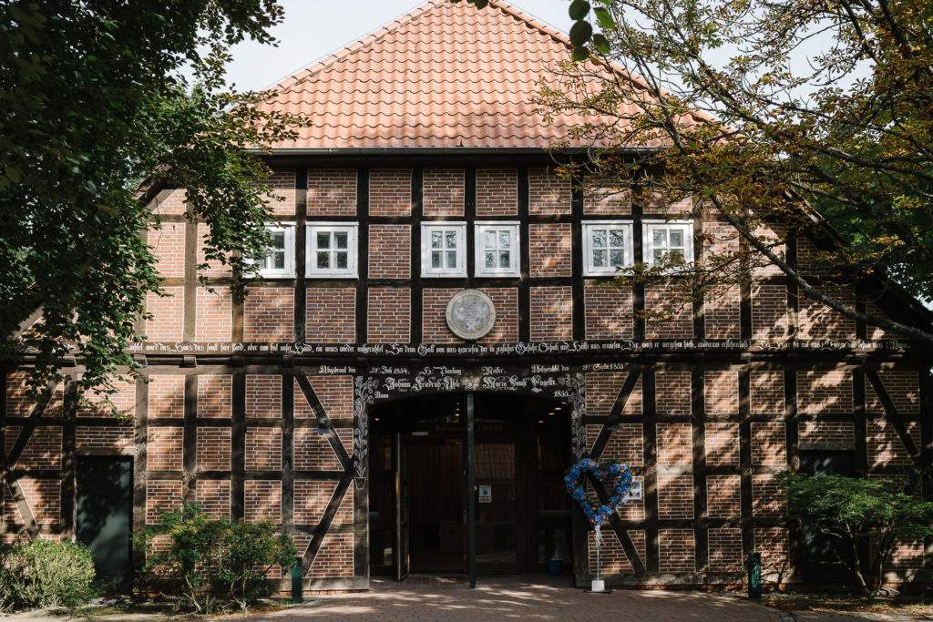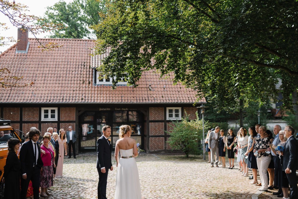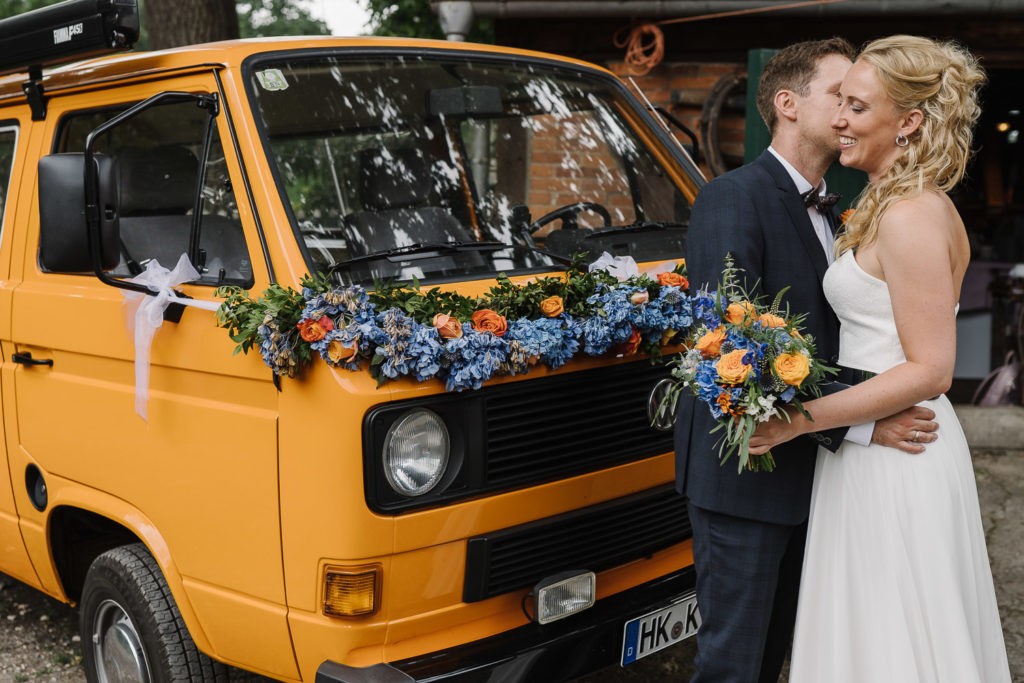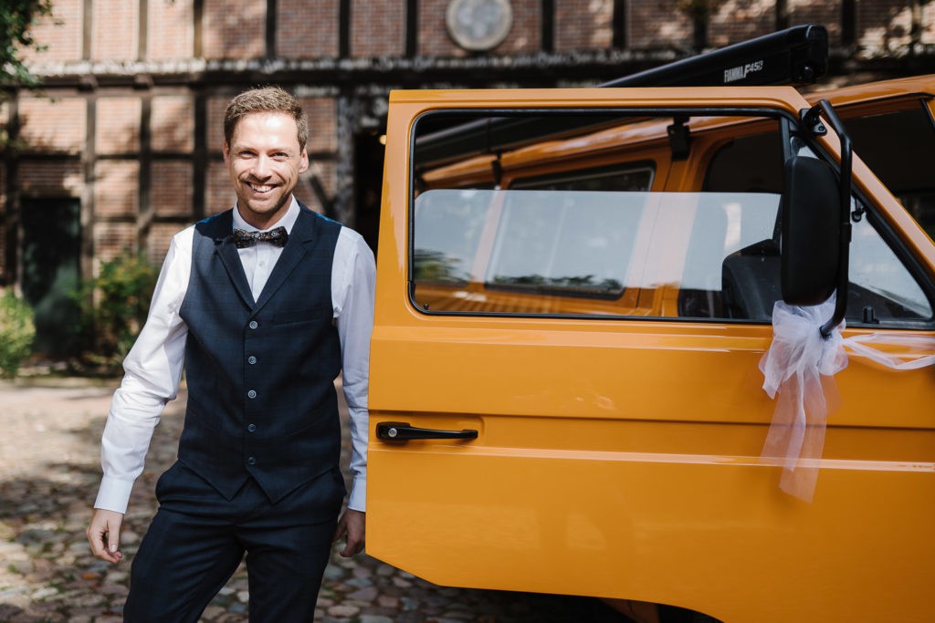 Der Tag begann mit einer berührenden standesamtlichen Trauung im charmanten Uhle Hof in Schwarmstedt. Die historische Atmosphäre des Uhle Hofs bot eine perfekte Kulisse für diese besondere Zeremonie. Der Bräutigam kam stilvoll in seinem eigenen orangenen VW Bulli an, mit dem das Brautpaar bereits viele unvergessliche Reisen unternommen hatte. Dieser persönliche Touch machte den Moment noch besonderer.