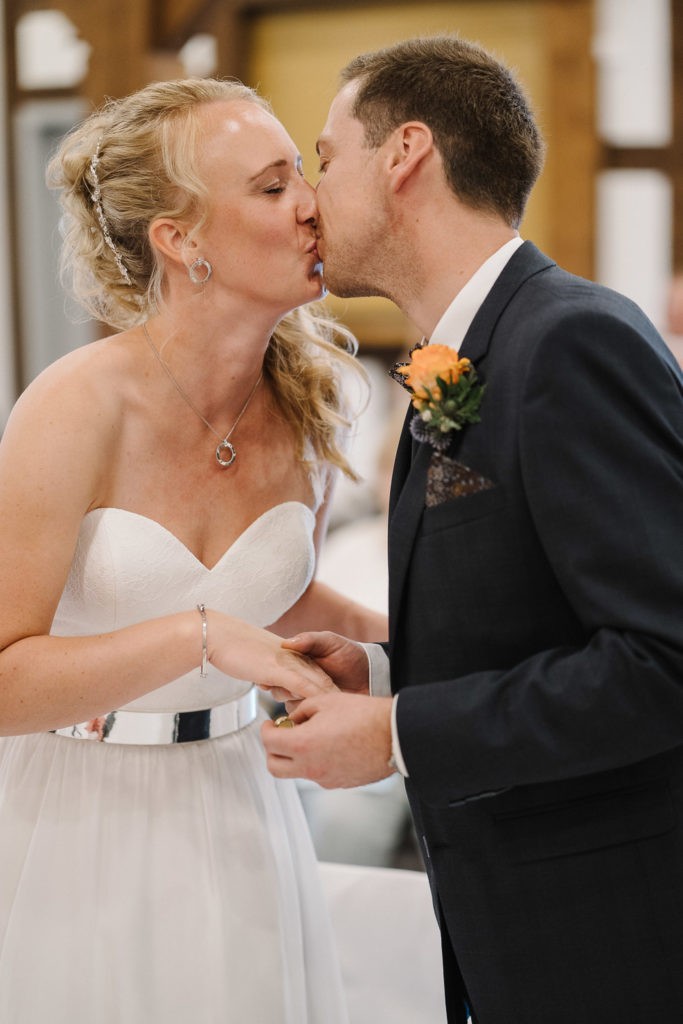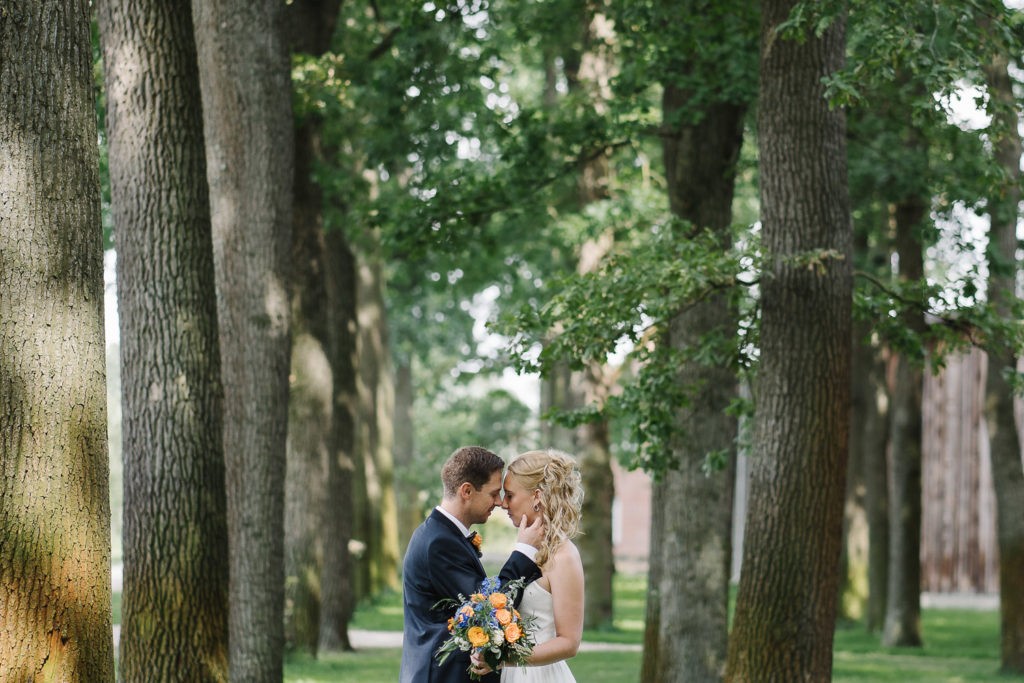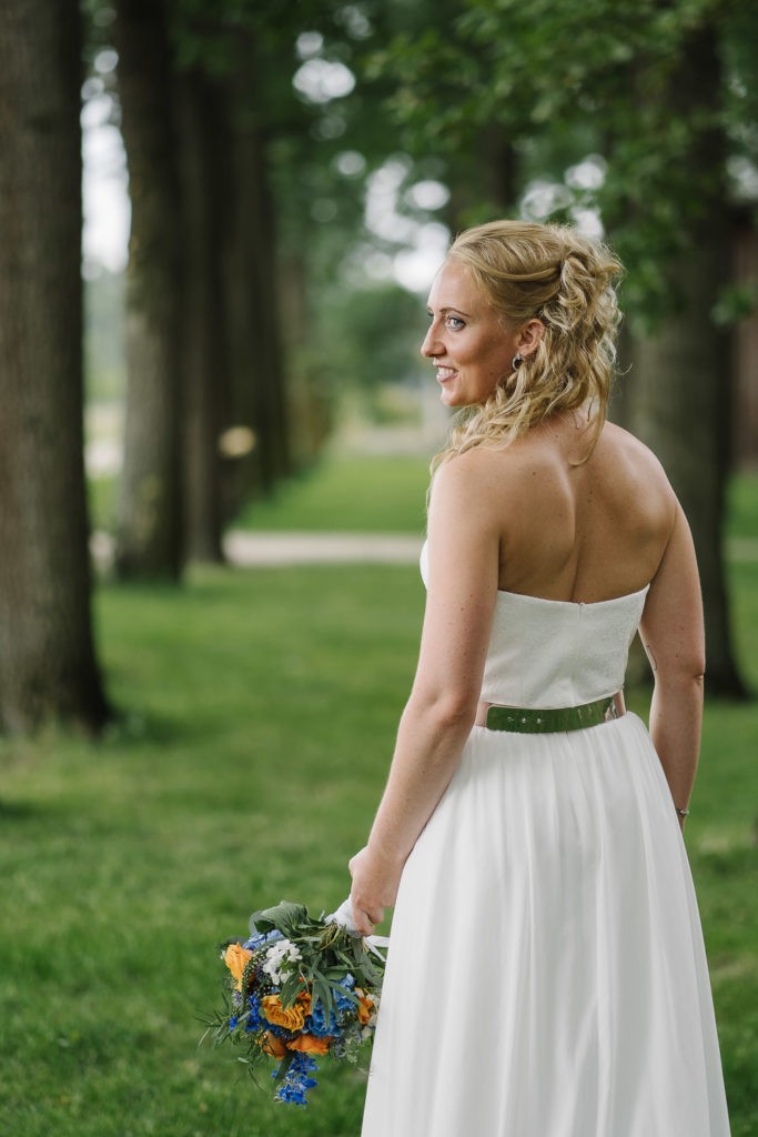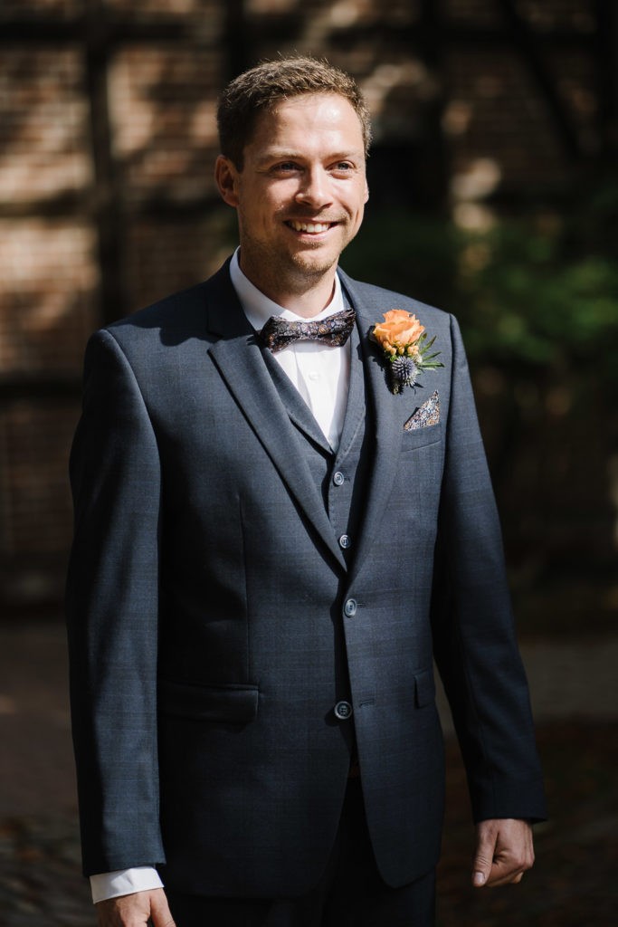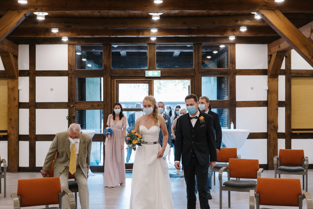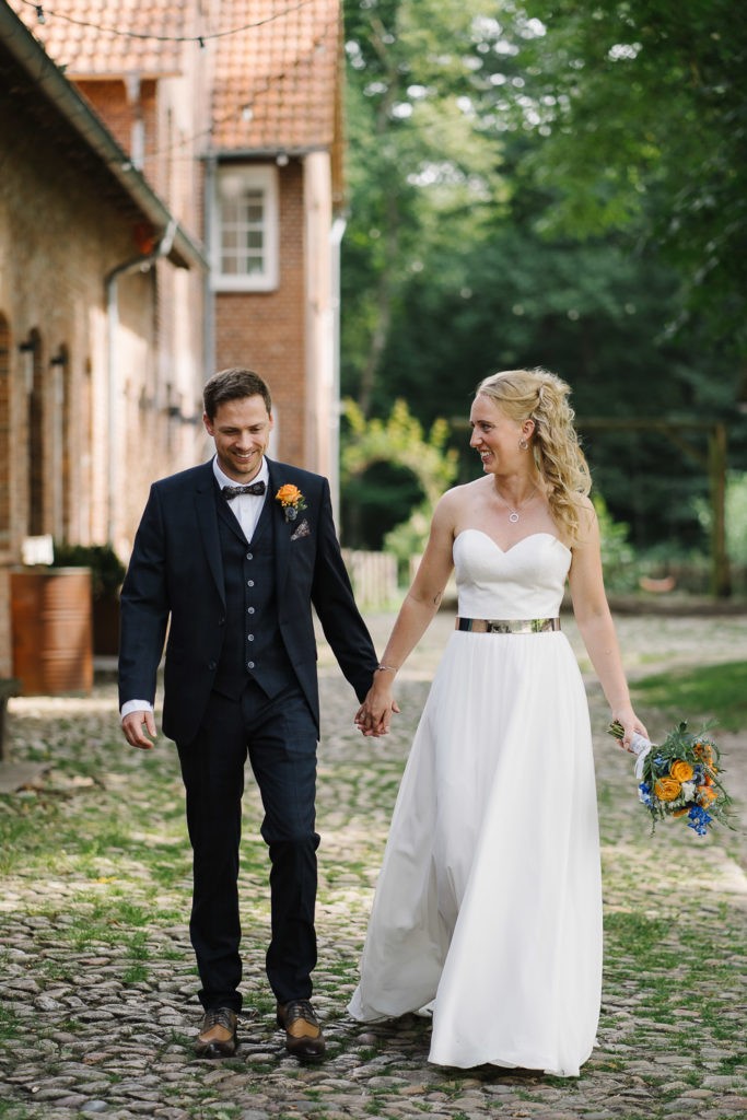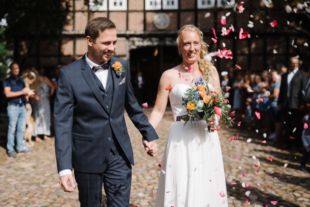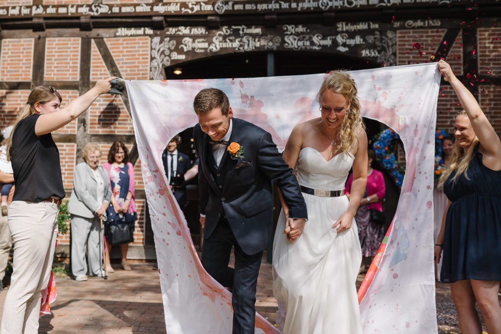 Der Tag begann mit einer berührenden standesamtlichen Trauung im charmanten Uhle Hof in Schwarmstedt. Die historische Atmosphäre des Uhle Hofs bot eine perfekte Kulisse für diese besondere Zeremonie. Der Bräutigam kam stilvoll in seinem eigenen orangenen VW Bulli an, mit dem das Brautpaar bereits viele unvergessliche Reisen unternommen hatte. Dieser persönliche Touch machte den Moment noch besonderer.
