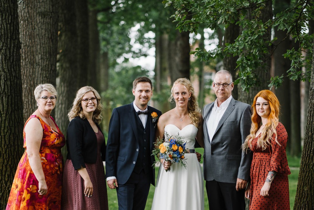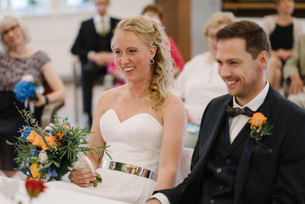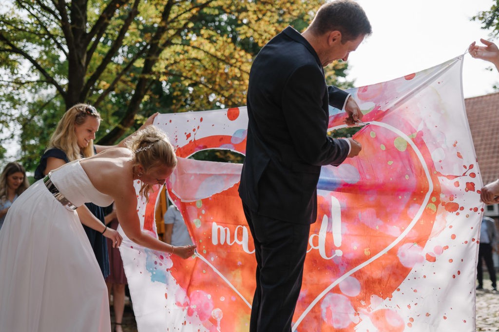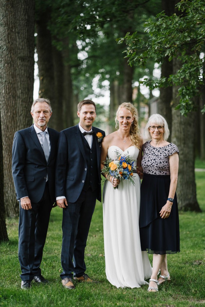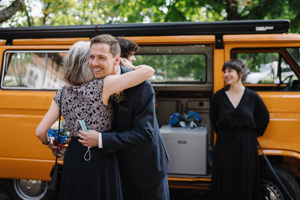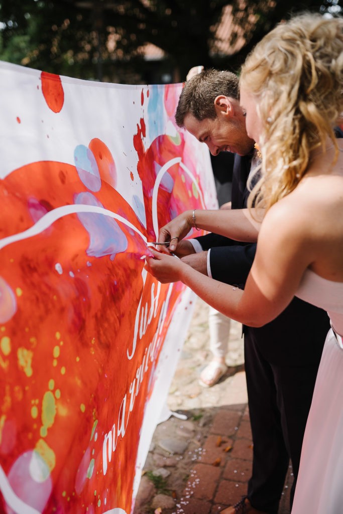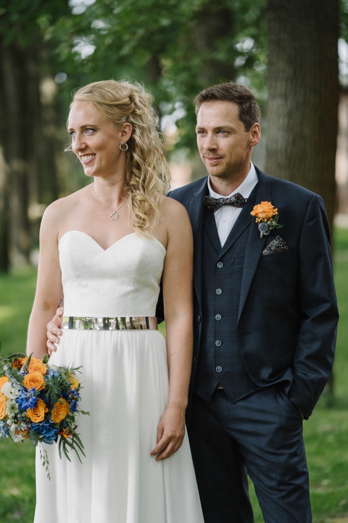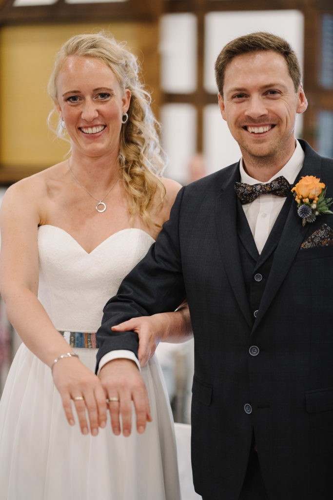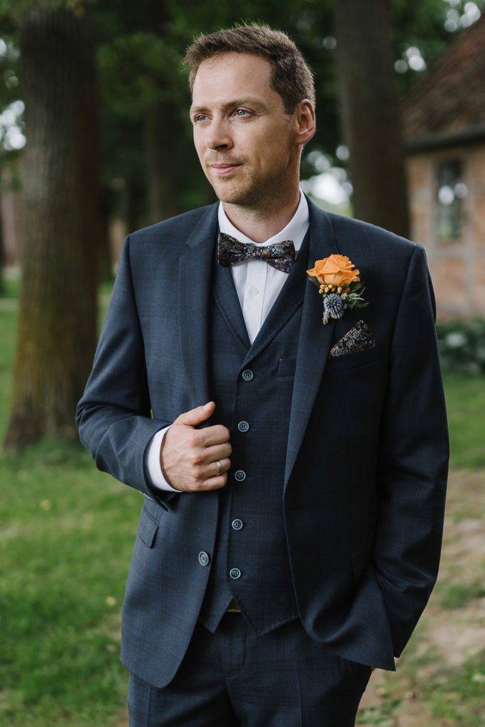Der Tag begann mit einer berührenden standesamtlichen Trauung im charmanten Uhle Hof in Schwarmstedt. Die historische Atmosphäre des Uhle Hofs bot eine perfekte Kulisse für diese besondere Zeremonie. Der Bräutigam kam stilvoll in seinem eigenen orangenen VW Bulli an, mit dem das Brautpaar bereits viele unvergessliche Reisen unternommen hatte. Dieser persönliche Touch machte den Moment noch besonderer.