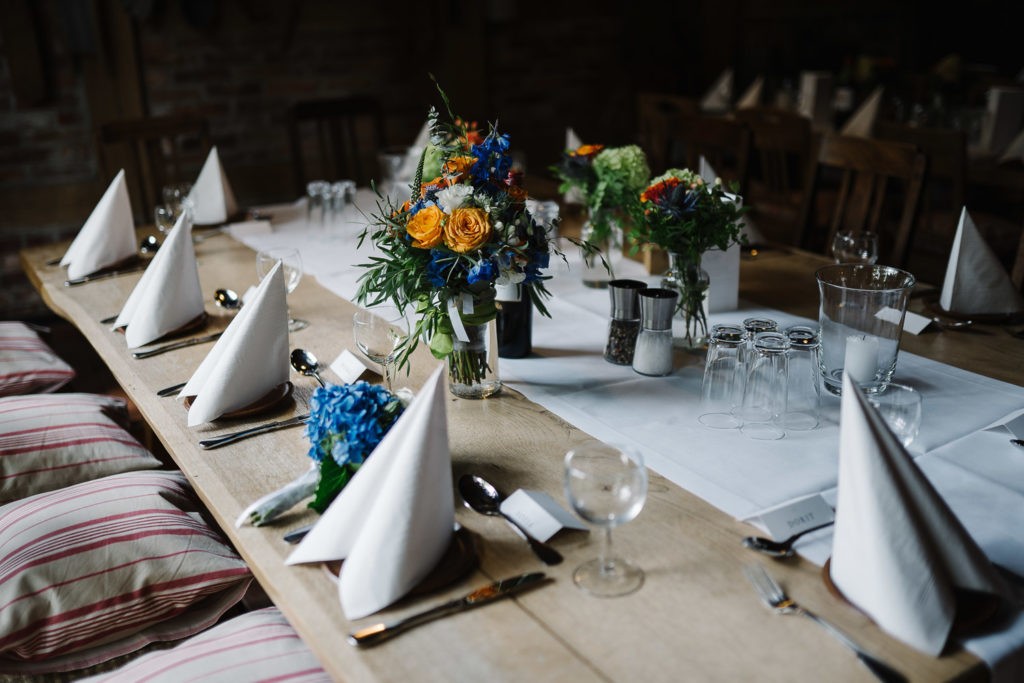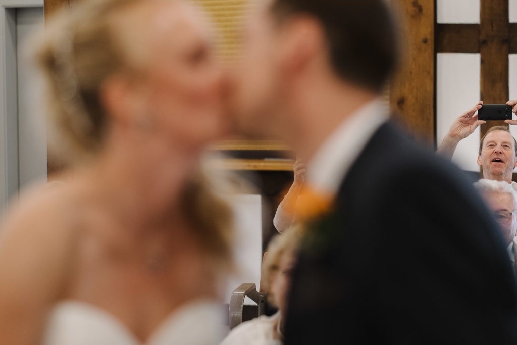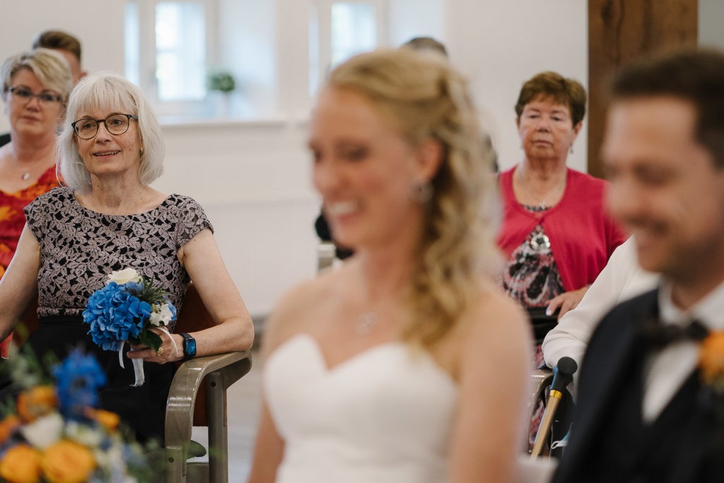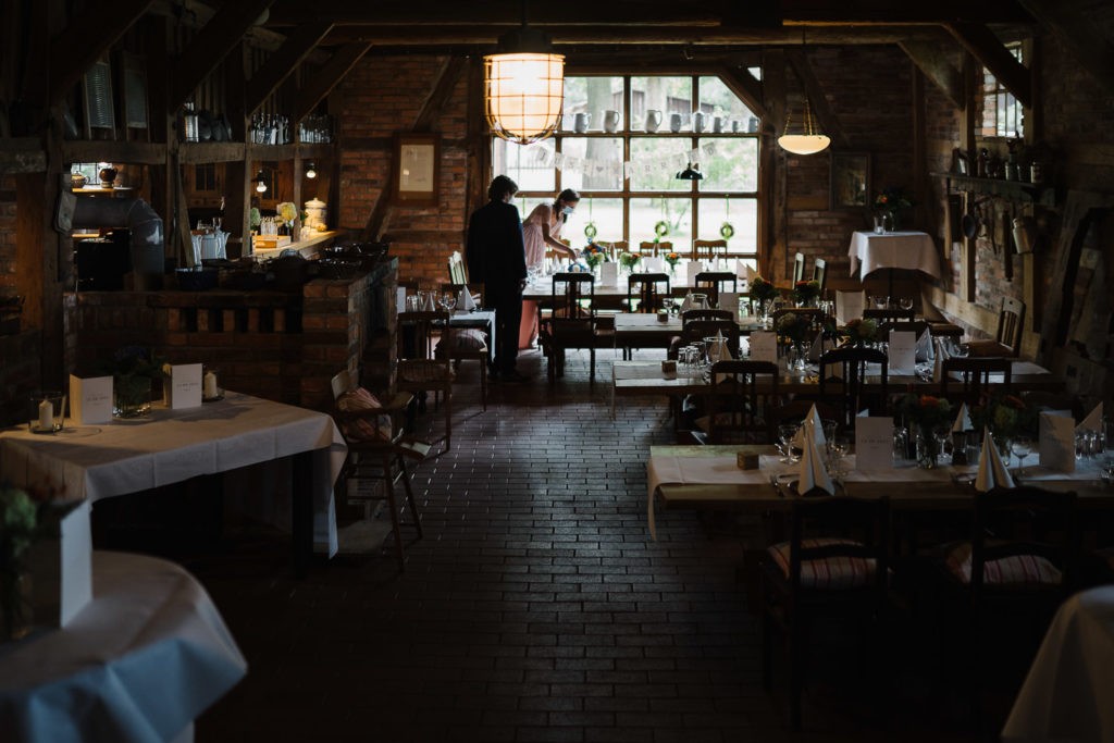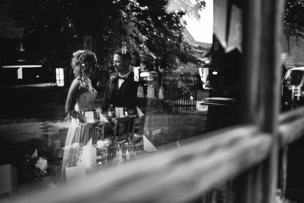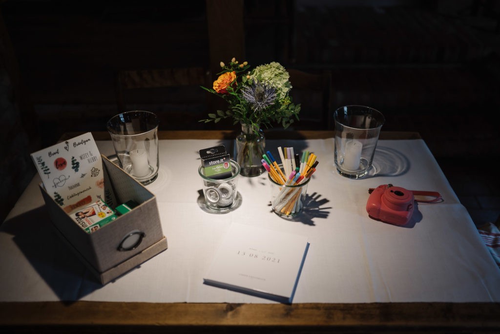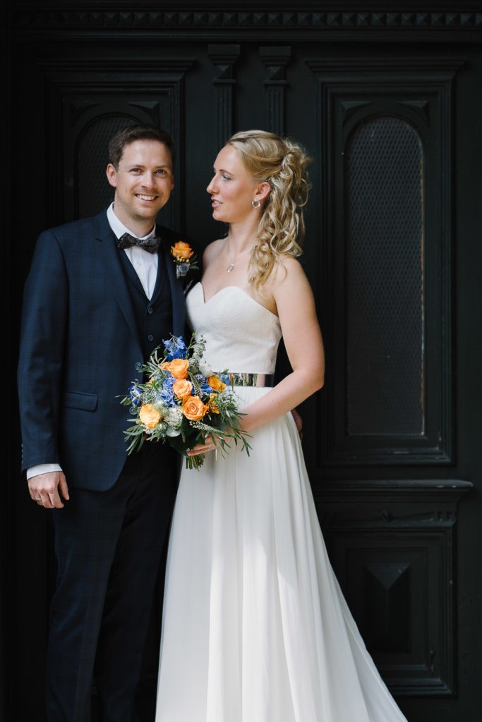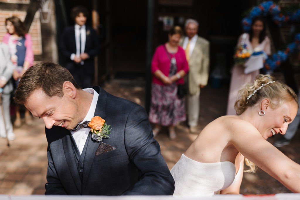 Der Tag begann mit einer berührenden standesamtlichen Trauung im charmanten Uhle Hof in Schwarmstedt. Die historische Atmosphäre des Uhle Hofs bot eine perfekte Kulisse für diese besondere Zeremonie. Der Bräutigam kam stilvoll in seinem eigenen orangenen VW Bulli an, mit dem das Brautpaar bereits viele unvergessliche Reisen unternommen hatte. Dieser persönliche Touch machte den Moment noch besonderer.