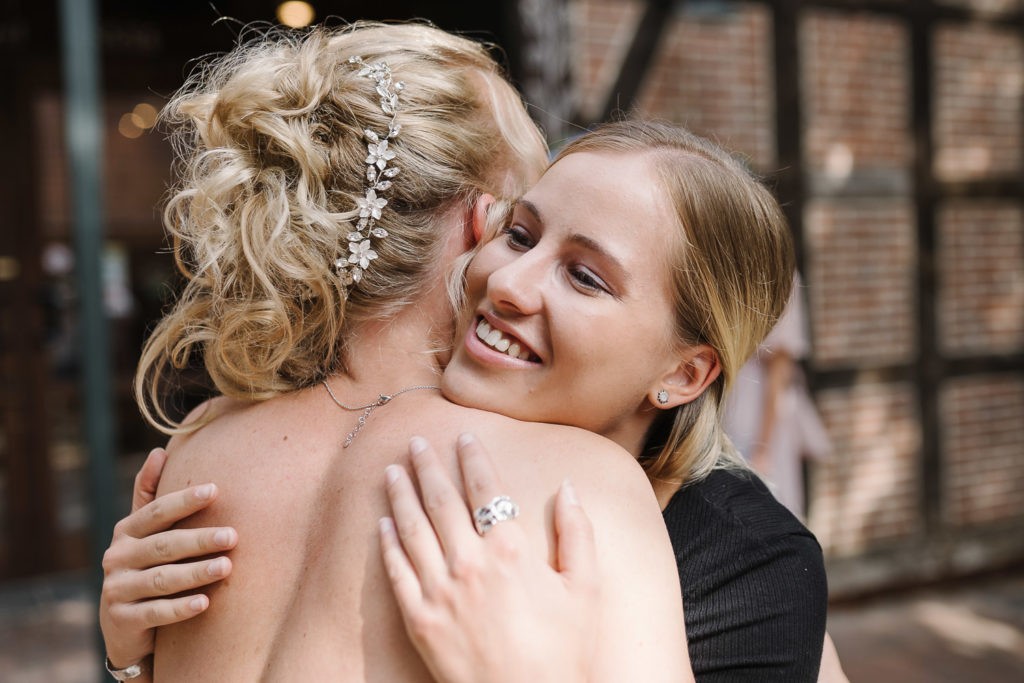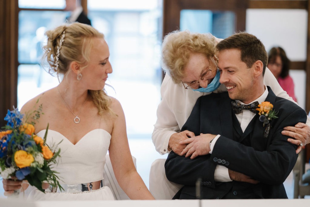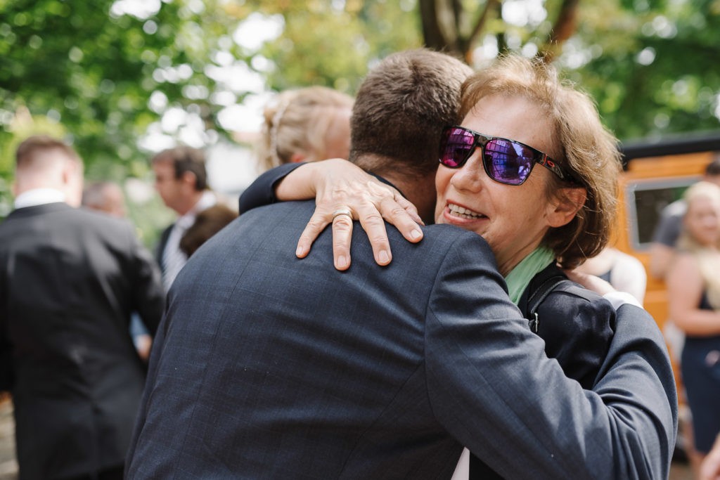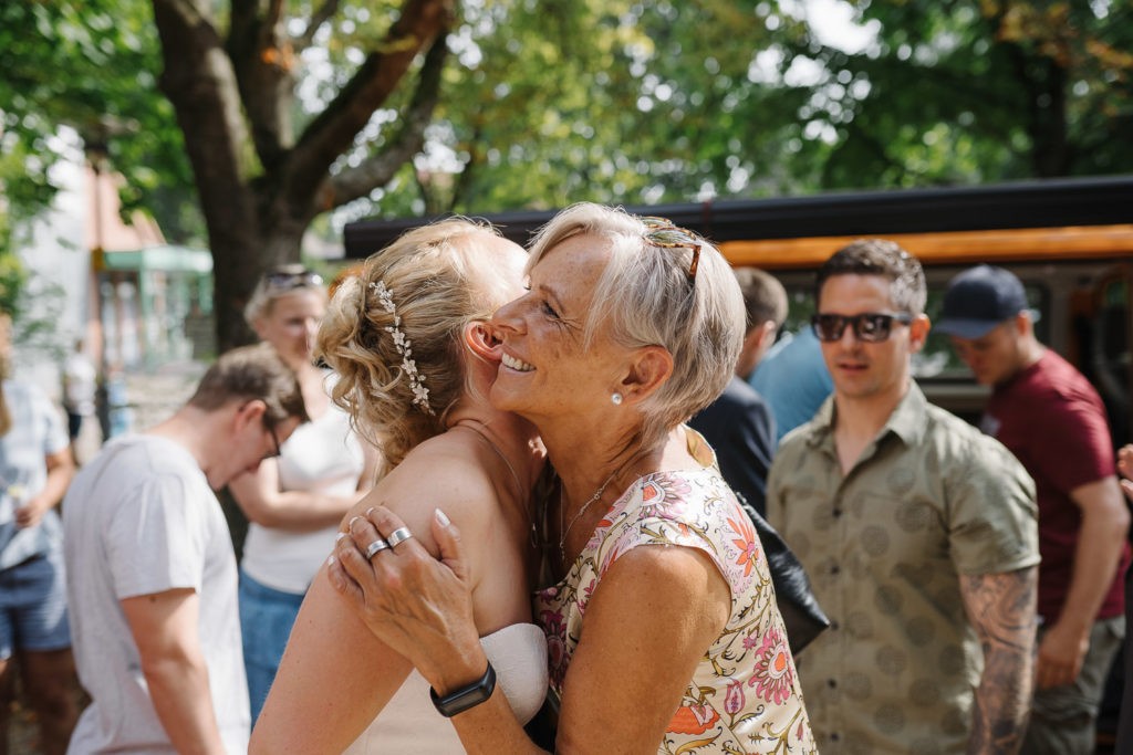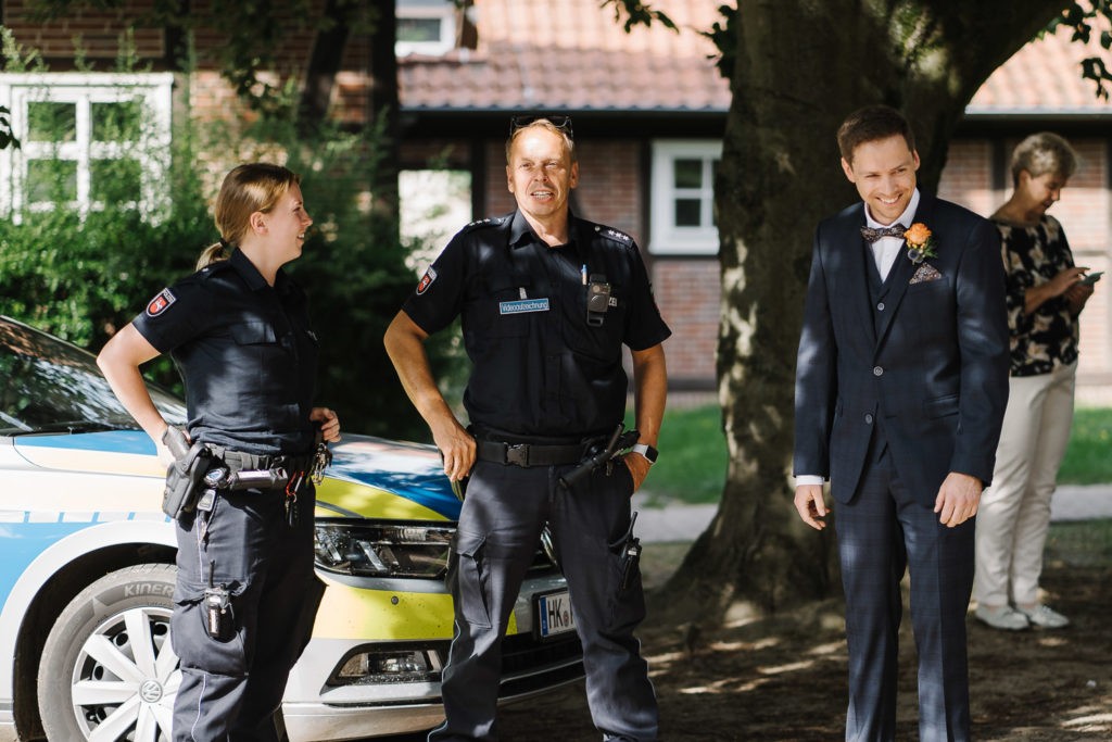 Nach der emotionalen Trauung folgte eine herzliche Gratulation von Familie und vielen Freunden. Es wurde angestoßen, ausgiebig gelacht und die Freude des Augenblicks geteilt. Sogar befreundete Polizeibeamte kamen kurz vorbei, um ihre Glückwünsche zu überbringen – ein humorvoller und herzerwärmender Moment, der die Verbundenheit und Freundschaft des Brautpaares zeigte.