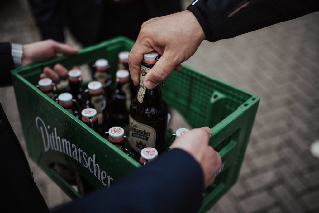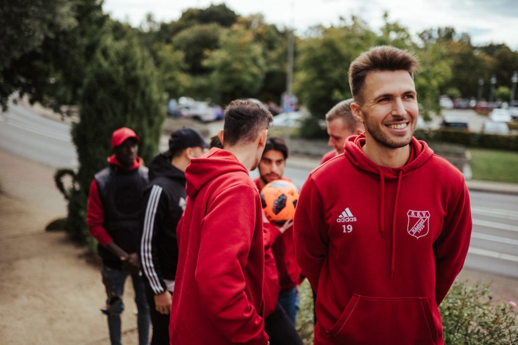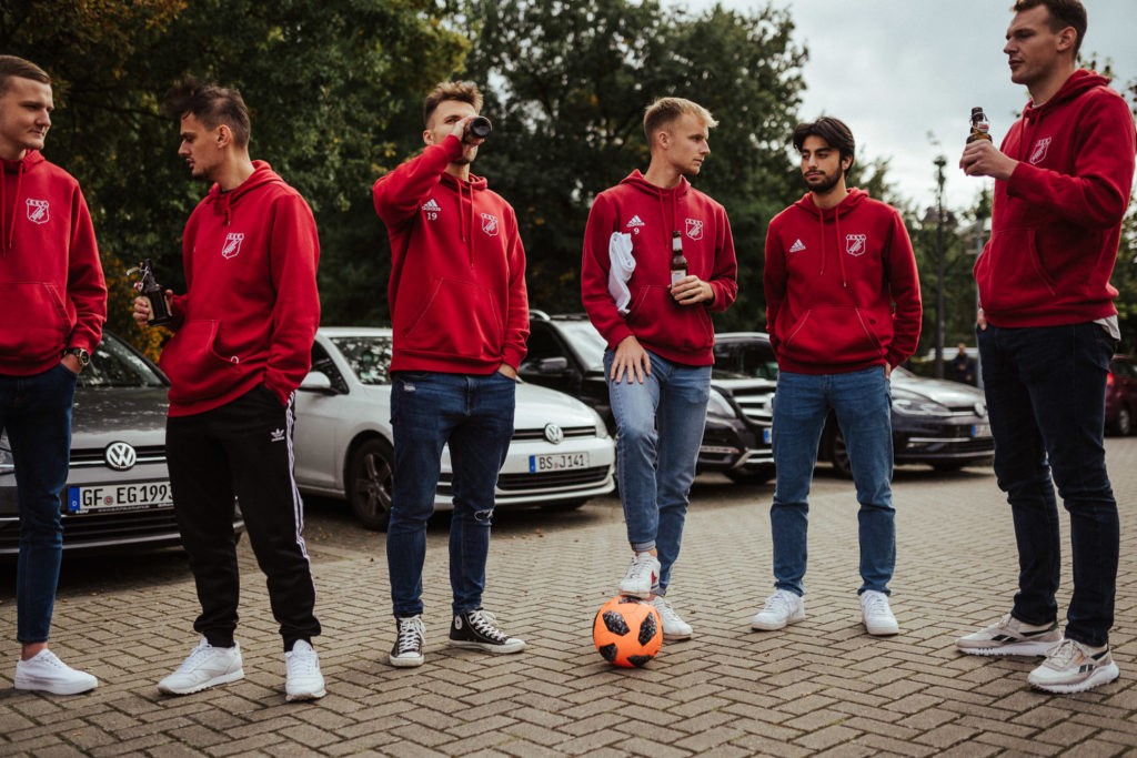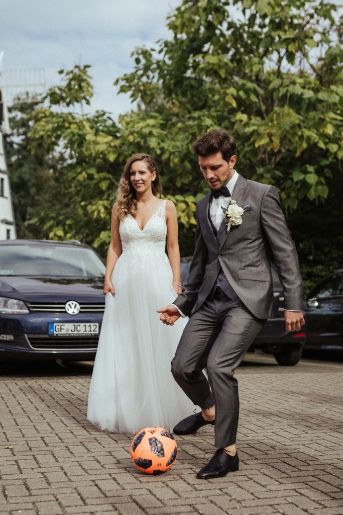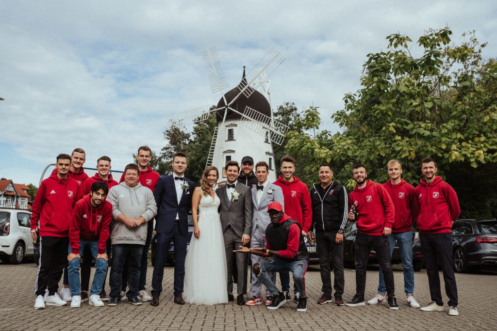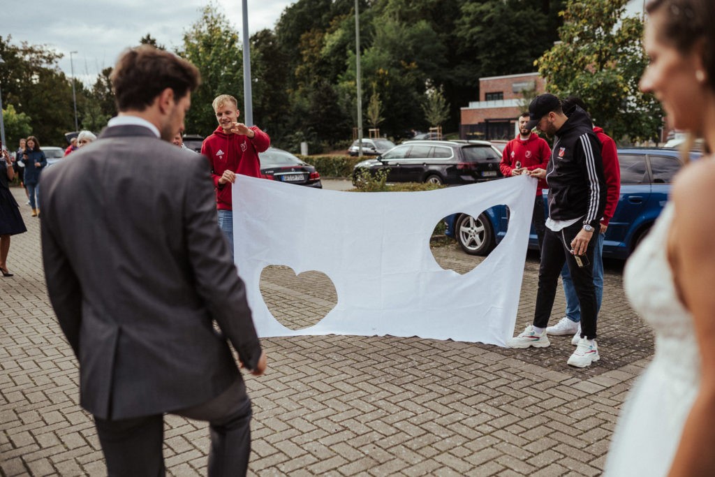 Nach der Trauung folgte eine herzliche Gratulation, gefolgt von einer besonderen Überraschung: Der Fußballverein des Bräutigams hatte sich etwas Einzigartiges einfallen lassen. Anstatt das traditionelle Herz aus einem Bettlaken zu schneiden, musste der Bräutigam durch ein Fußballtor aus Stoff schießen. Dieser humorvolle und persönliche Moment brachte alle zum Lachen und zeigte die besondere Verbindung des Bräutigams zu seinem Verein.